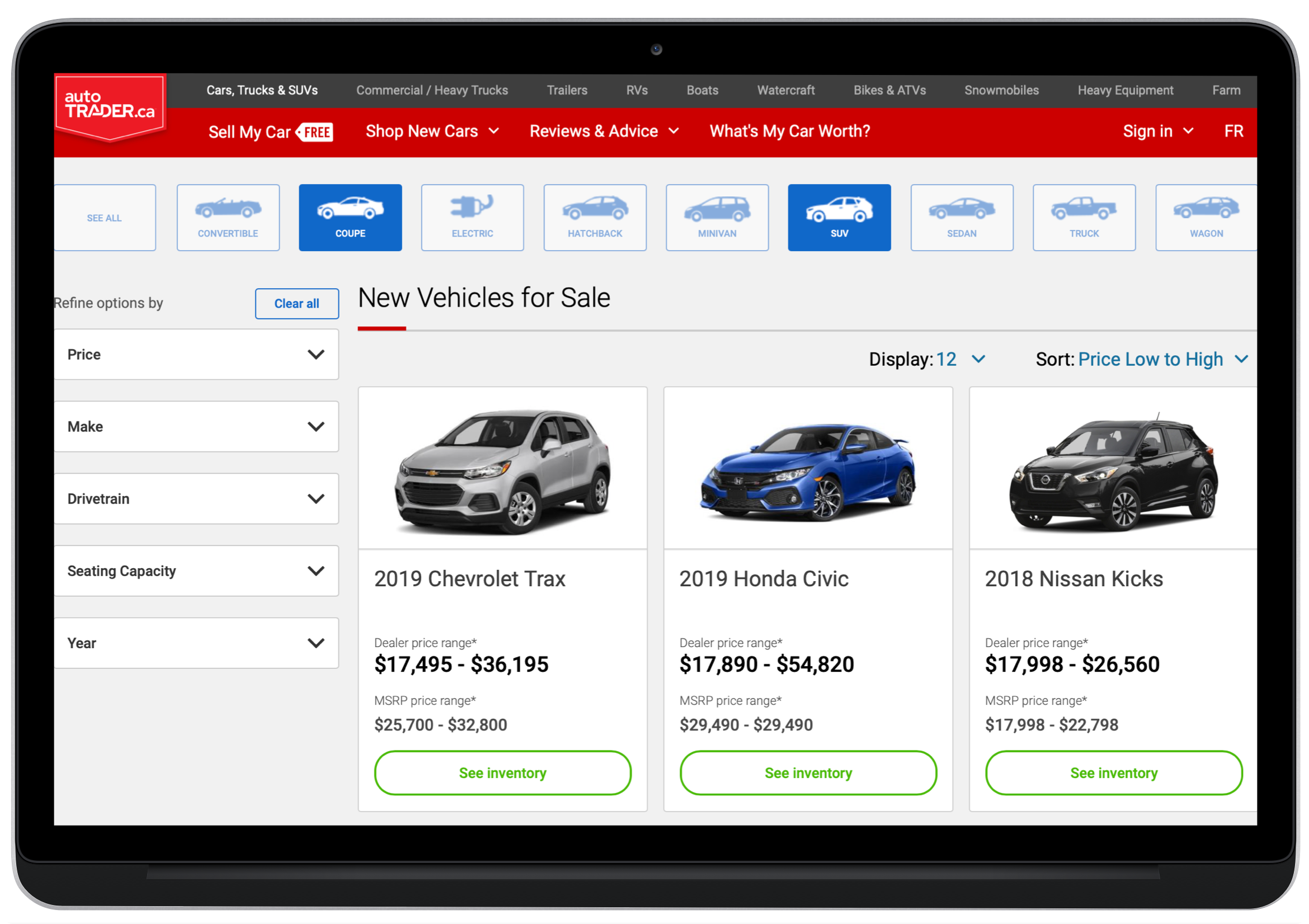 The options could be refined in an easy to use module to the left, where the user could choose the Make / Price / Drivetrain / Seating Capacity / Year.