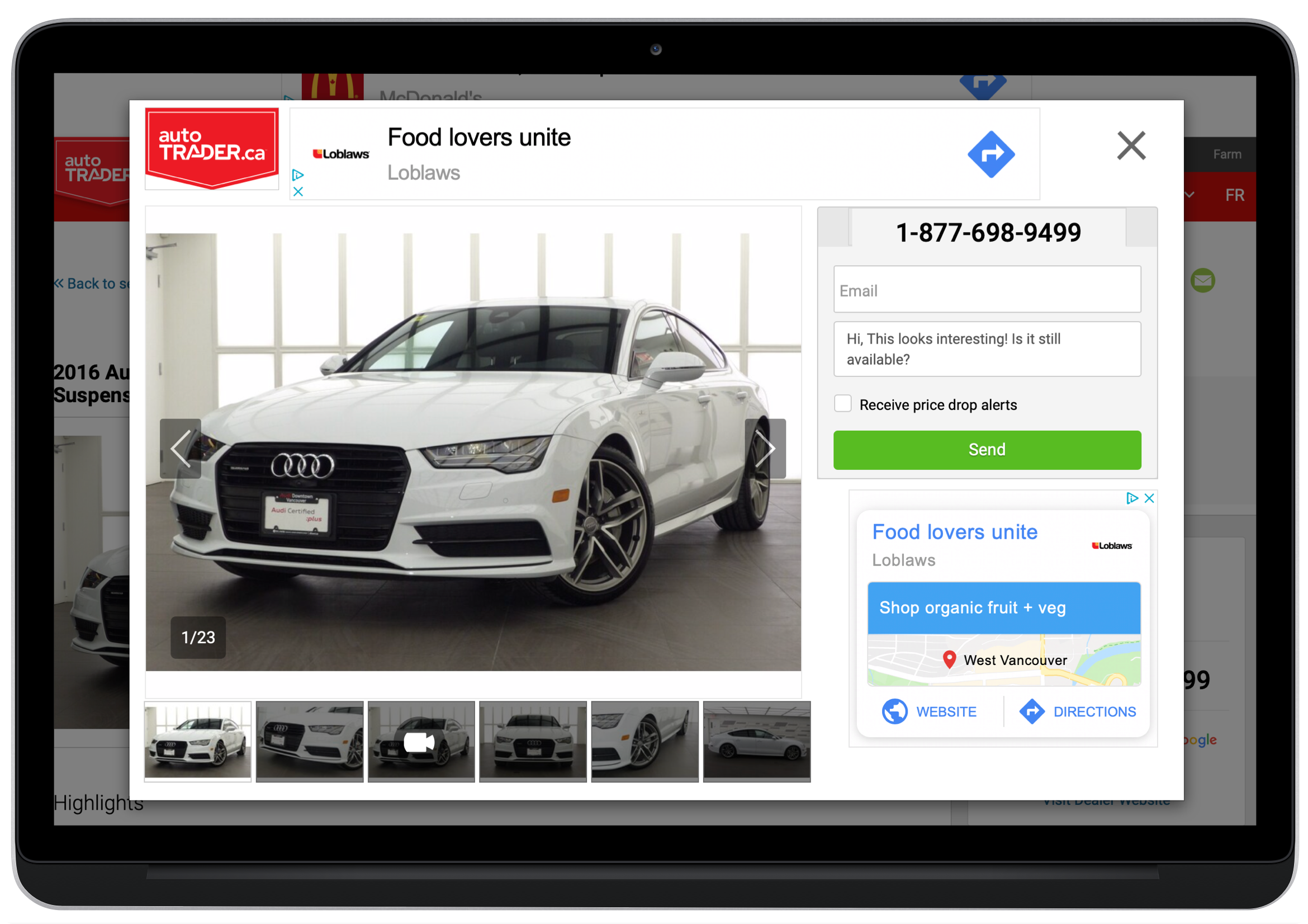 In the pop-up window containing all the photos and videos, a clever contact box was introduced, with a pre-filled section, where the user could send an email to ask if the vehicle was still available. A check mark to Receive Price Drop Alerts was added as well. Above all, the phone number was provided in bold, giving the user the option to call and inquire without having to "dig" for it on the page.