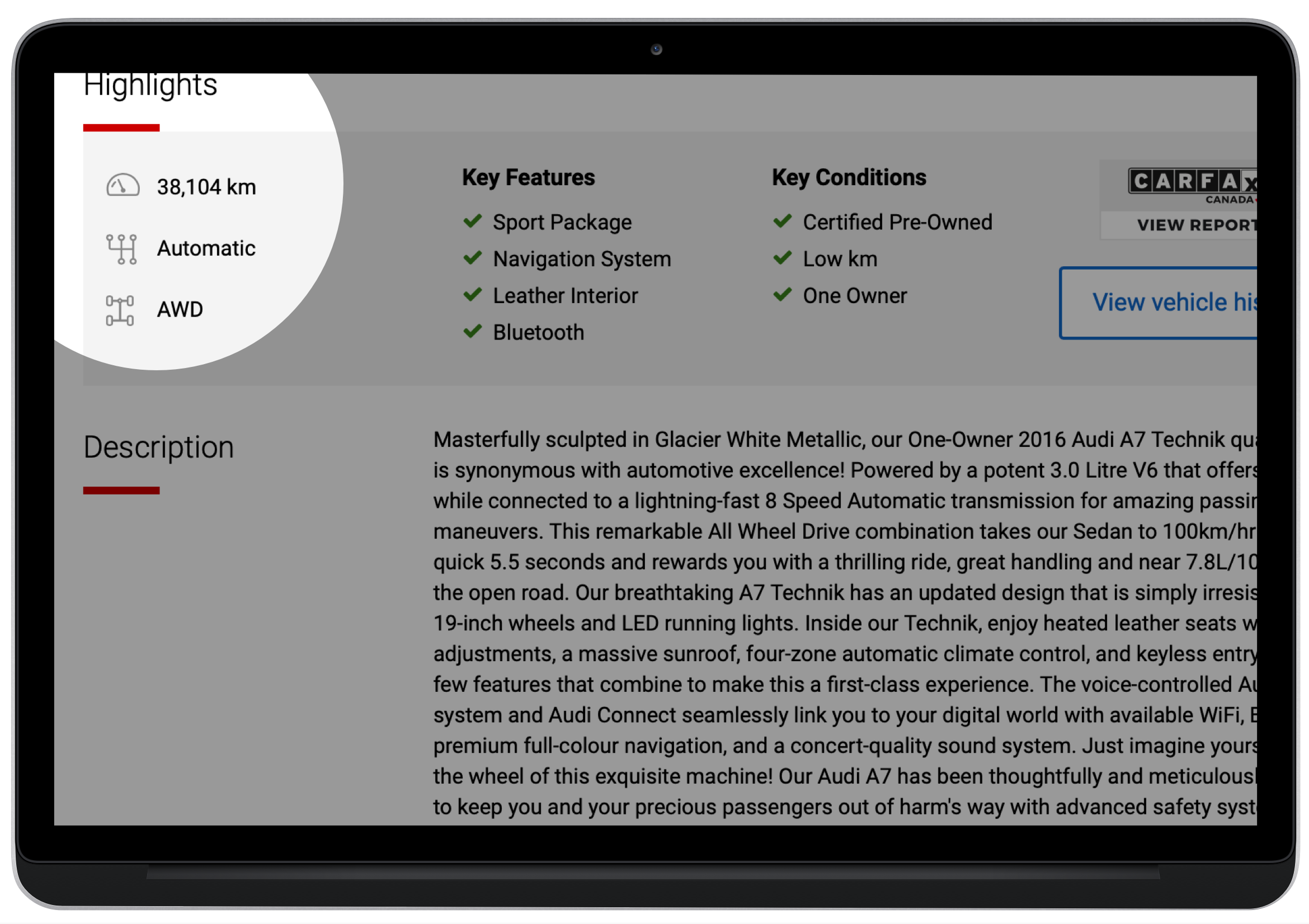 Further down the Vehicle Profile page, the user could peruse the Highlights and the Description of the vehicle. Immediately they could see the mileage, whether the car was automatic or not and what type of transmission it had (AWD, RWD). The Key Features and Key Conditions showed whether the vehicle had Bluetooth for instance, or if it was Certified Pre-Owned.