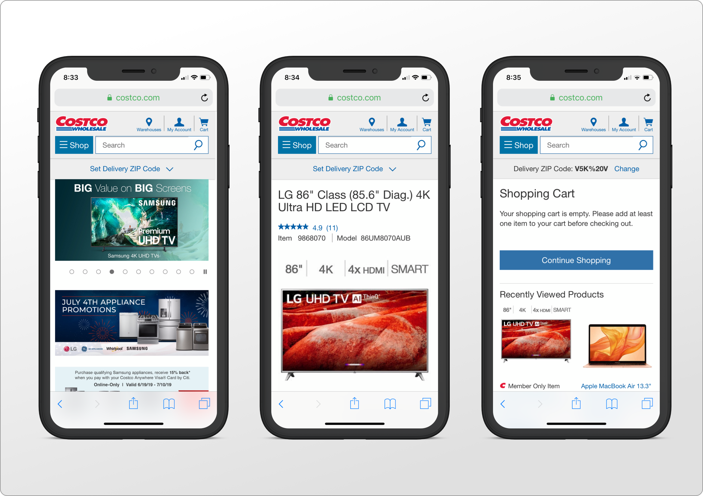 Design a mobile + desktop experience that would seamlessly incorporate into the existing Costco website (and potentially within their mobile app), which informed and enabled the user to purchase additional warranty, without interfering with the item purchasing process.