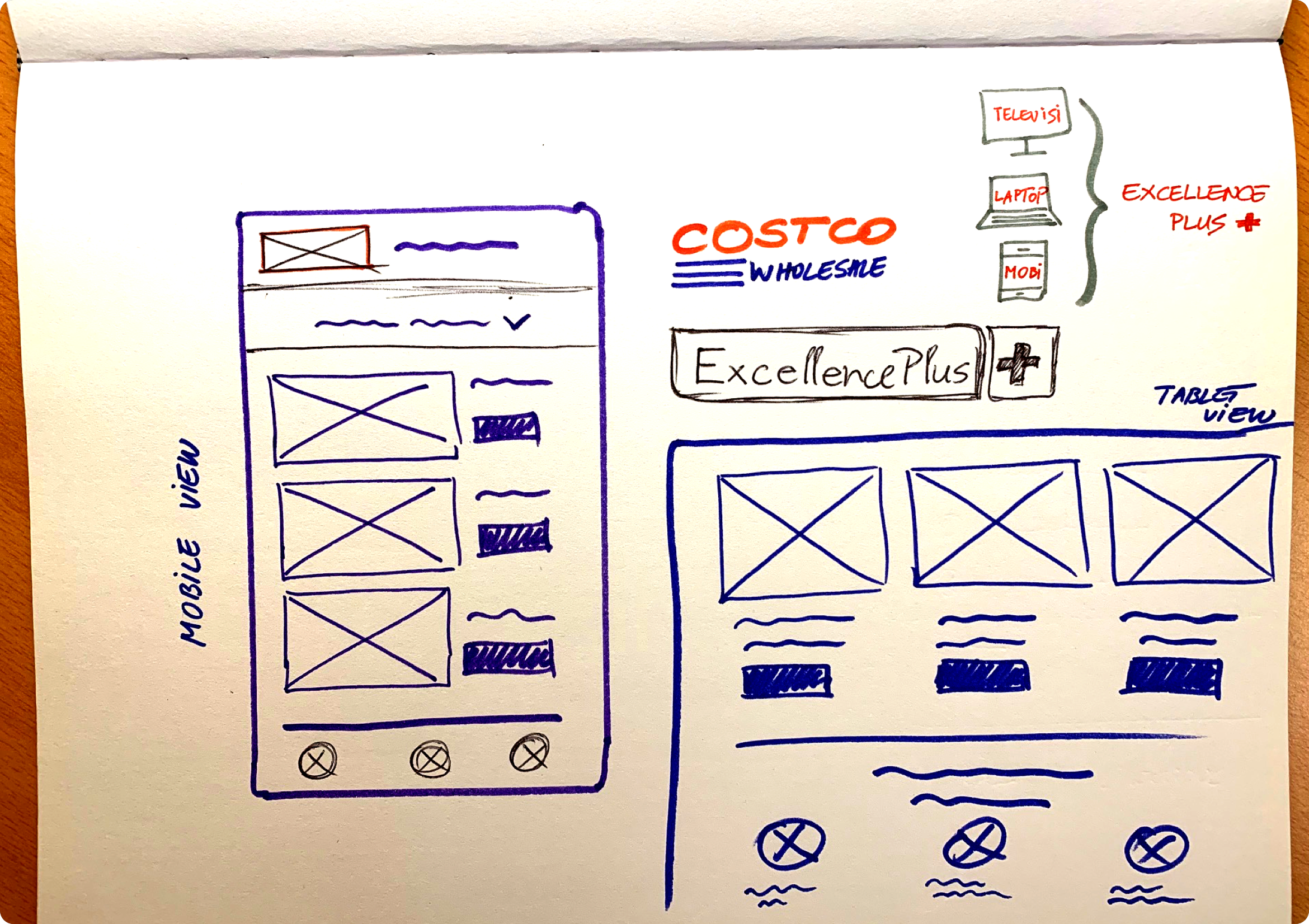 One of the initial steps in the process was to sketch a few key ideas on paper and share them with our team and the stakeholders. Introducing the main sections as clickable tabs, rather than having them all on one long page, was one of the proposals. These sections were highlighting the fact that Costco's Care Plan offers real protection (or reimbursement, if not possible to replace or repair), showing what a typical manufacturer's warranty covers versus the comprehensible plan offered by Costco.