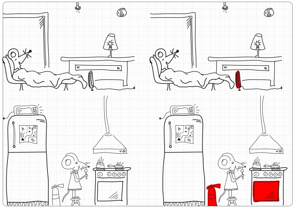 Below is a clear example of how the bedroom radiator is too close to the blanket, thus becoming a fire hazard (red). Also, in the kitchen, I chose the highlight (in red, again) the oven and the fire extinguisher (not a fire hazard, but a fire hazard "cure").
