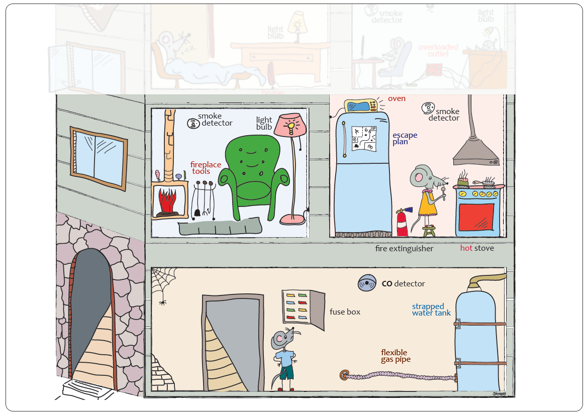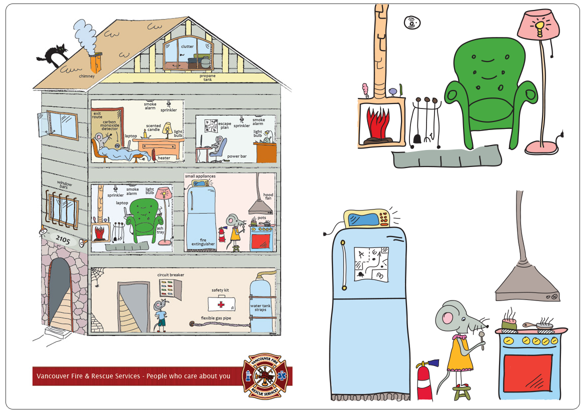 Thus, I created a typical Vancouver house in Illustrator, displaying a bedroom, an office, a living room and a kitchen on the 2 main floors, plus an attic and a basement, all with their common fire hazards. This project became known throughout the City as the "Mouse House".