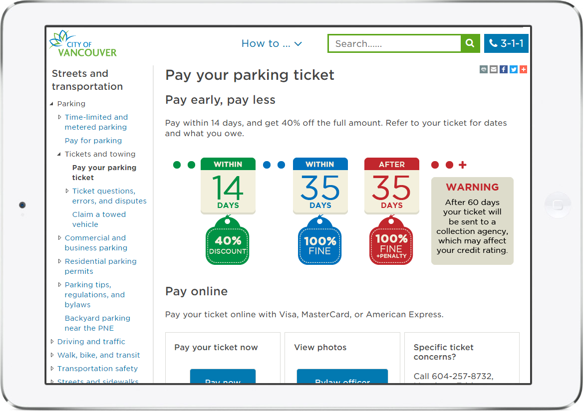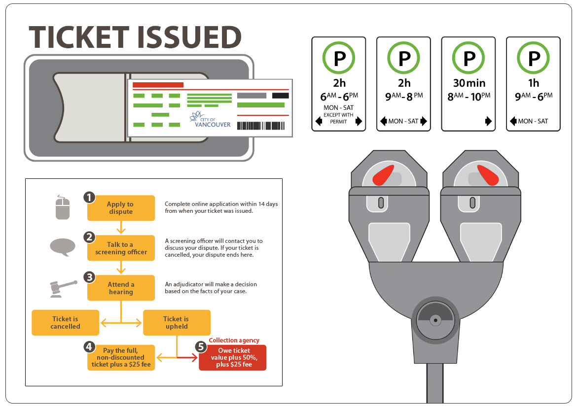 While working at the City of Vancouver as a Visual Content Strategist / Infographics Specialist, I was approached by the Engineering and Ticket Collections department with the following mandate: raise awareness and educate the citizens of Vancouver on how to pay for parking and what happens when someone gets a parking ticket.