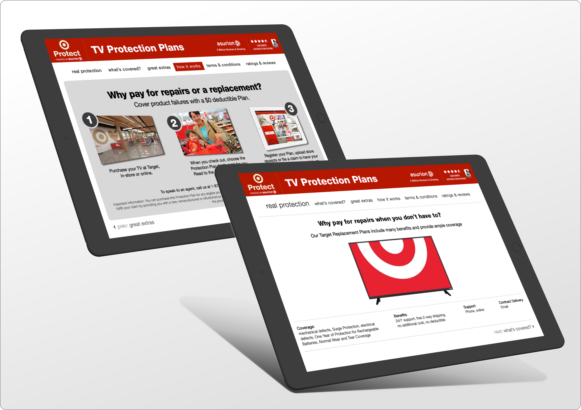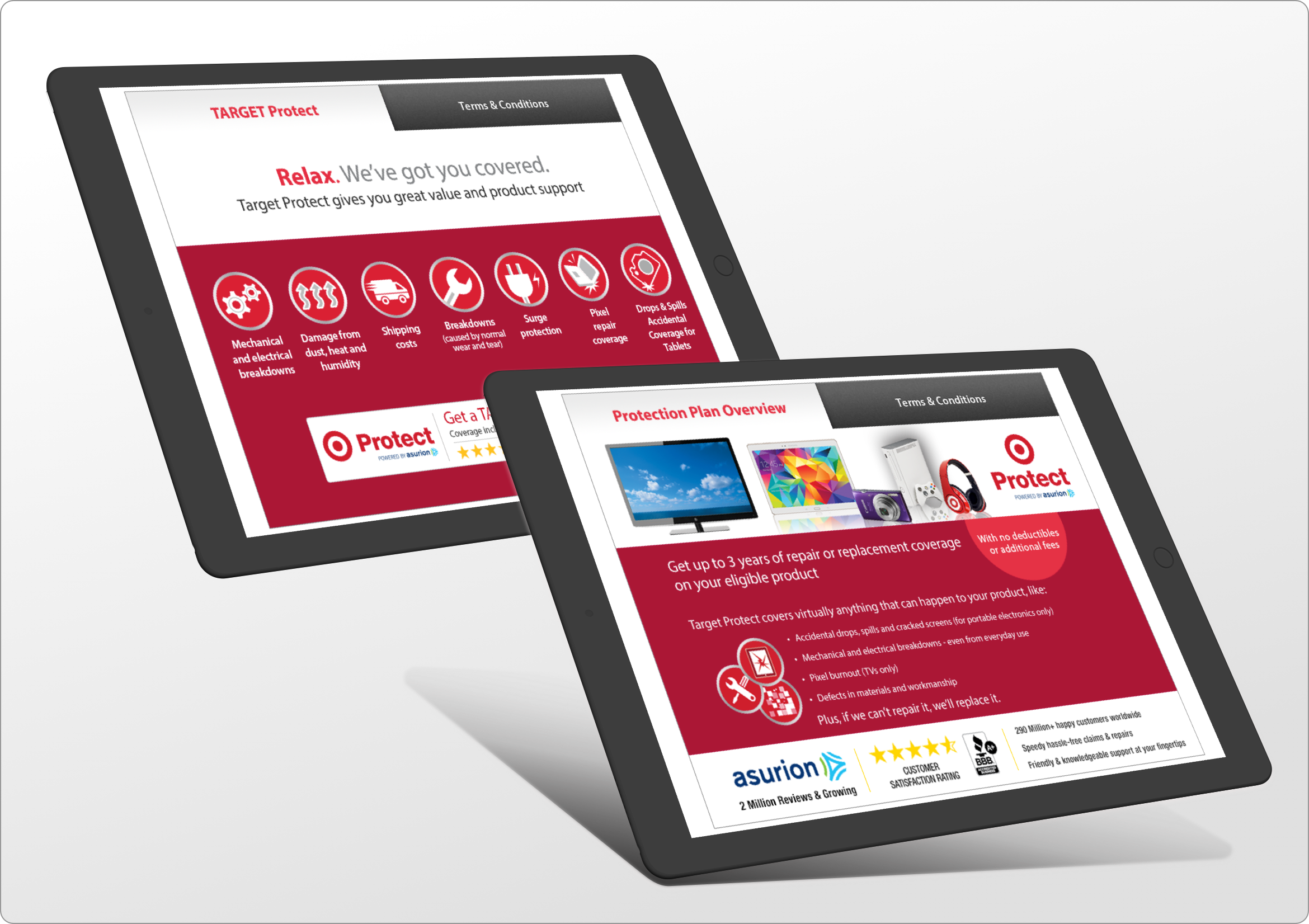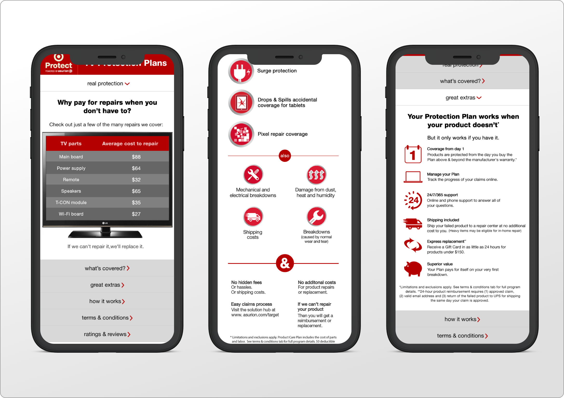 Target's extended warranty program is advertised under the "TARGET Protect" branding, and it's administered by Asurion. Sometimes also known as "Make Protection Happen", it is this section of Target's mobile and desktop experience that my team worked on.