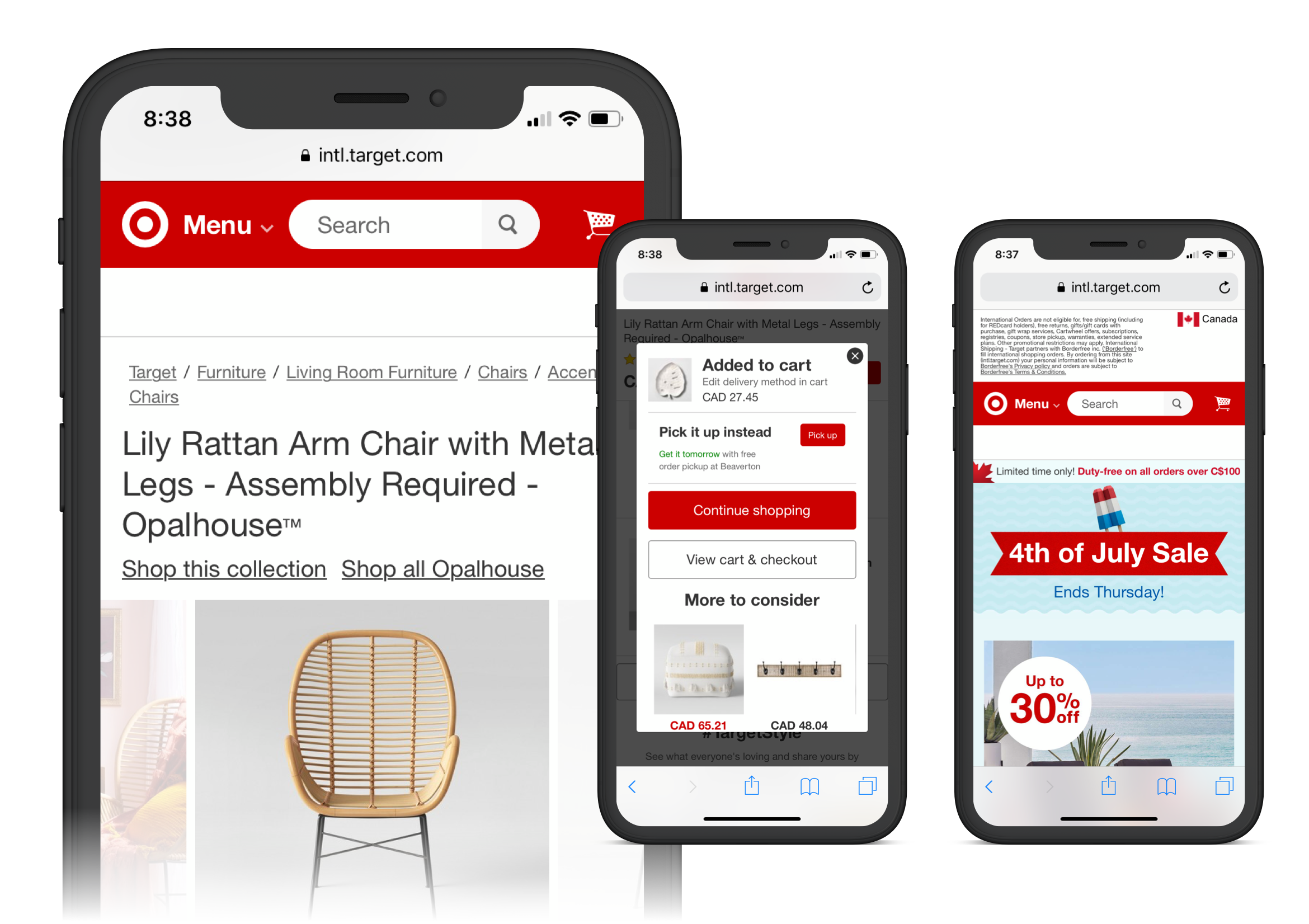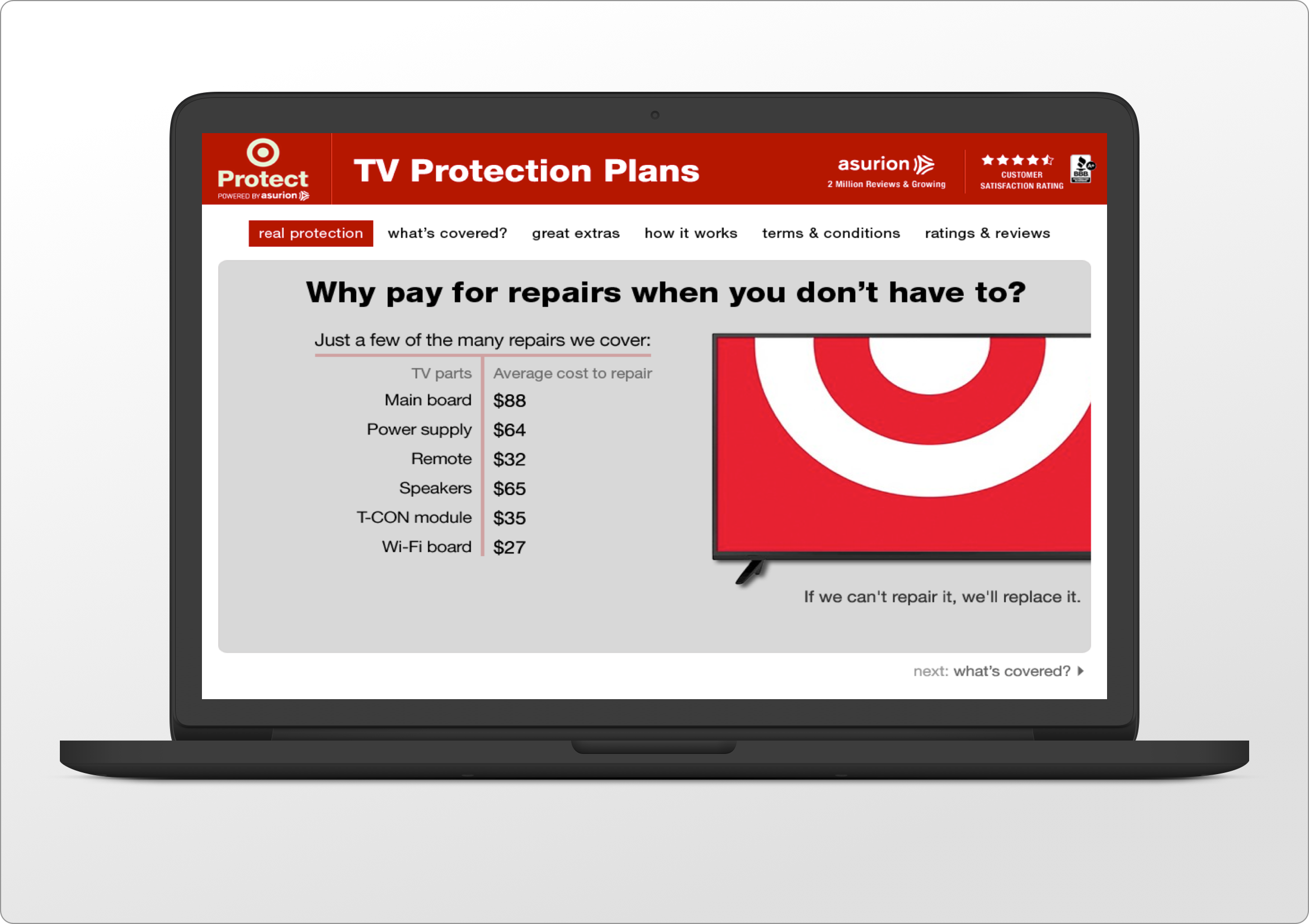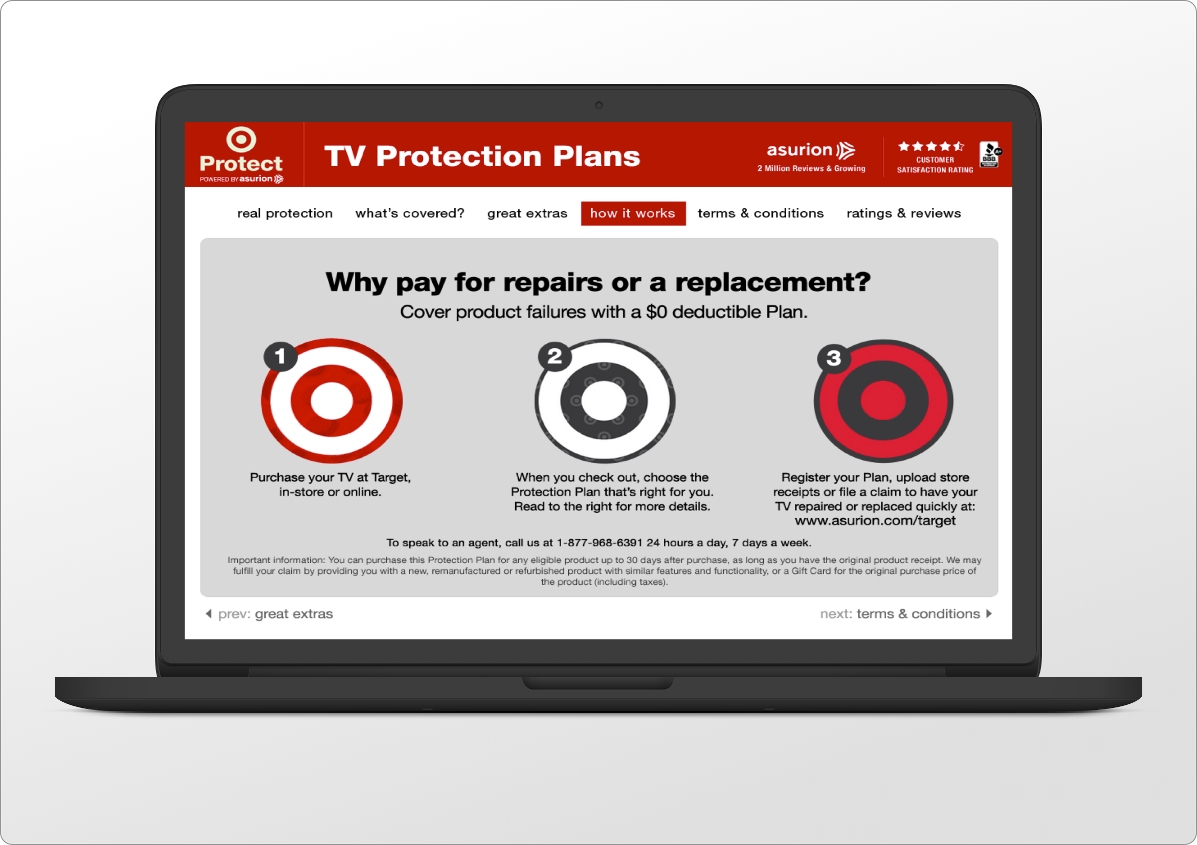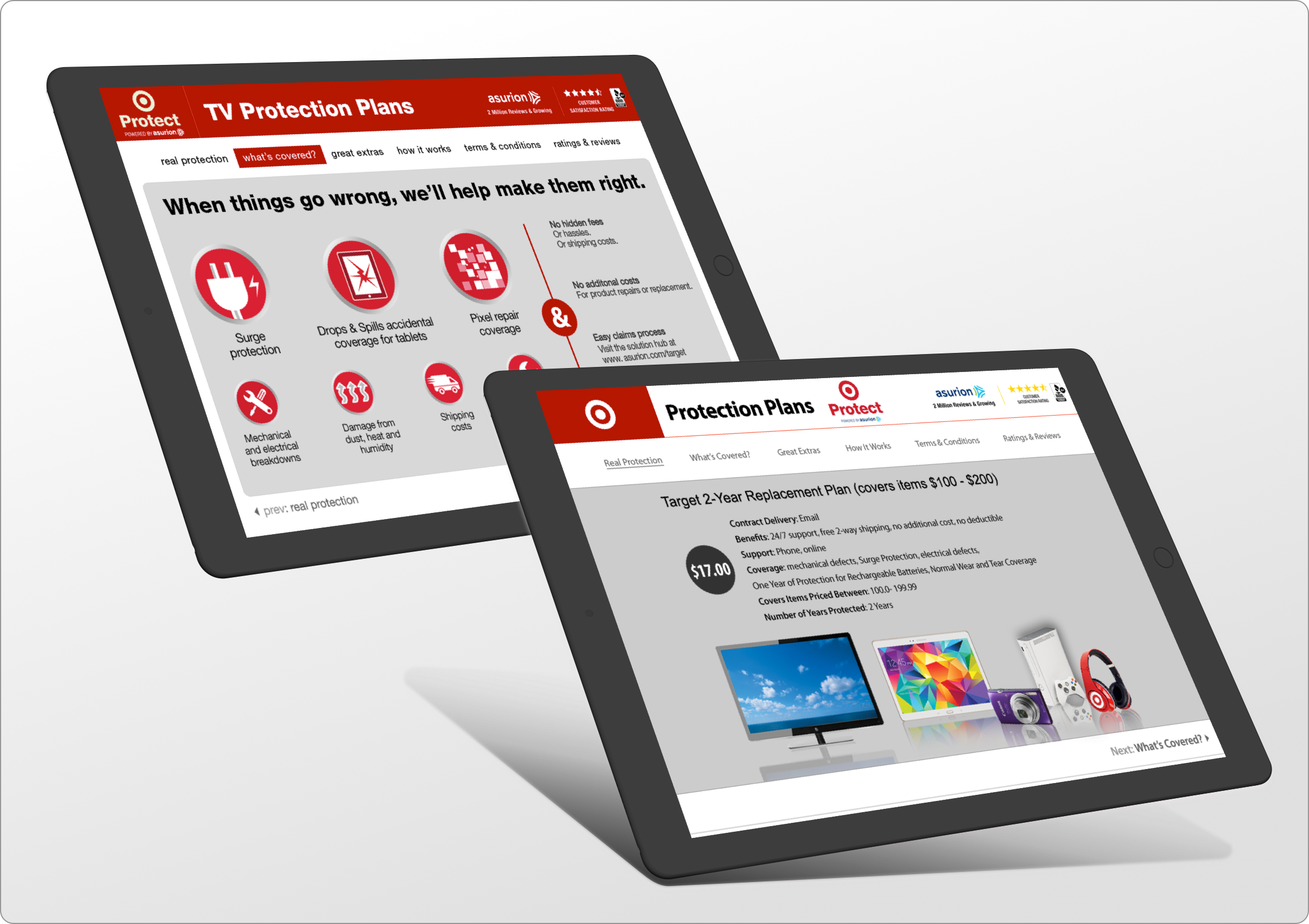 Target's extended warranty program is advertised under the "TARGET Protect" branding, and it's administered by Asurion. Sometimes also known as "Make Protection Happen", it is this section of Target's mobile and desktop experience that my team worked on.