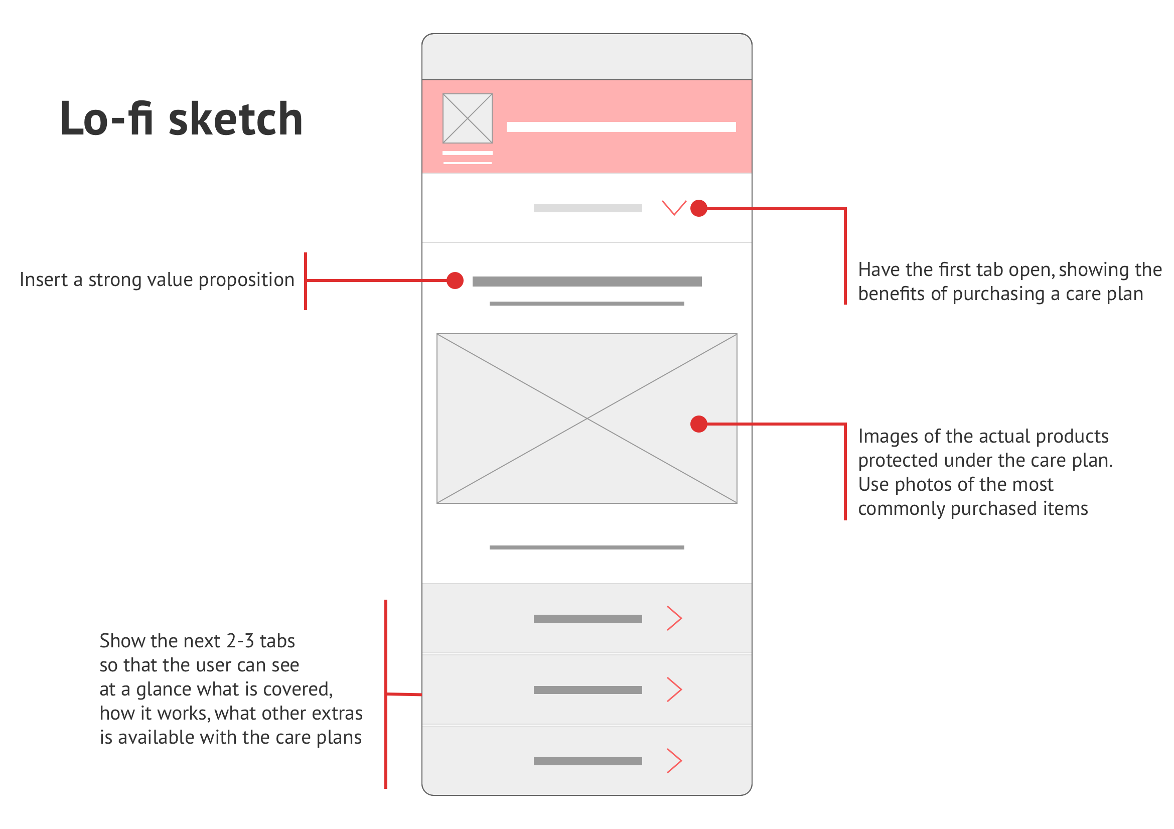 One of the initial steps in the process was to sketch a few key ideas on paper and share them with our team and the stakeholders. Introducing the main sections as clickable tabs, rather than having them all on one long page, was one of the proposals. These sections were highlighting the fact that Target's care plan offers real protection (or reimbursement, if not possible to replace or repair), showing what a typical manufacturer's warranty covers versus the comprehensible plan offered by Target.