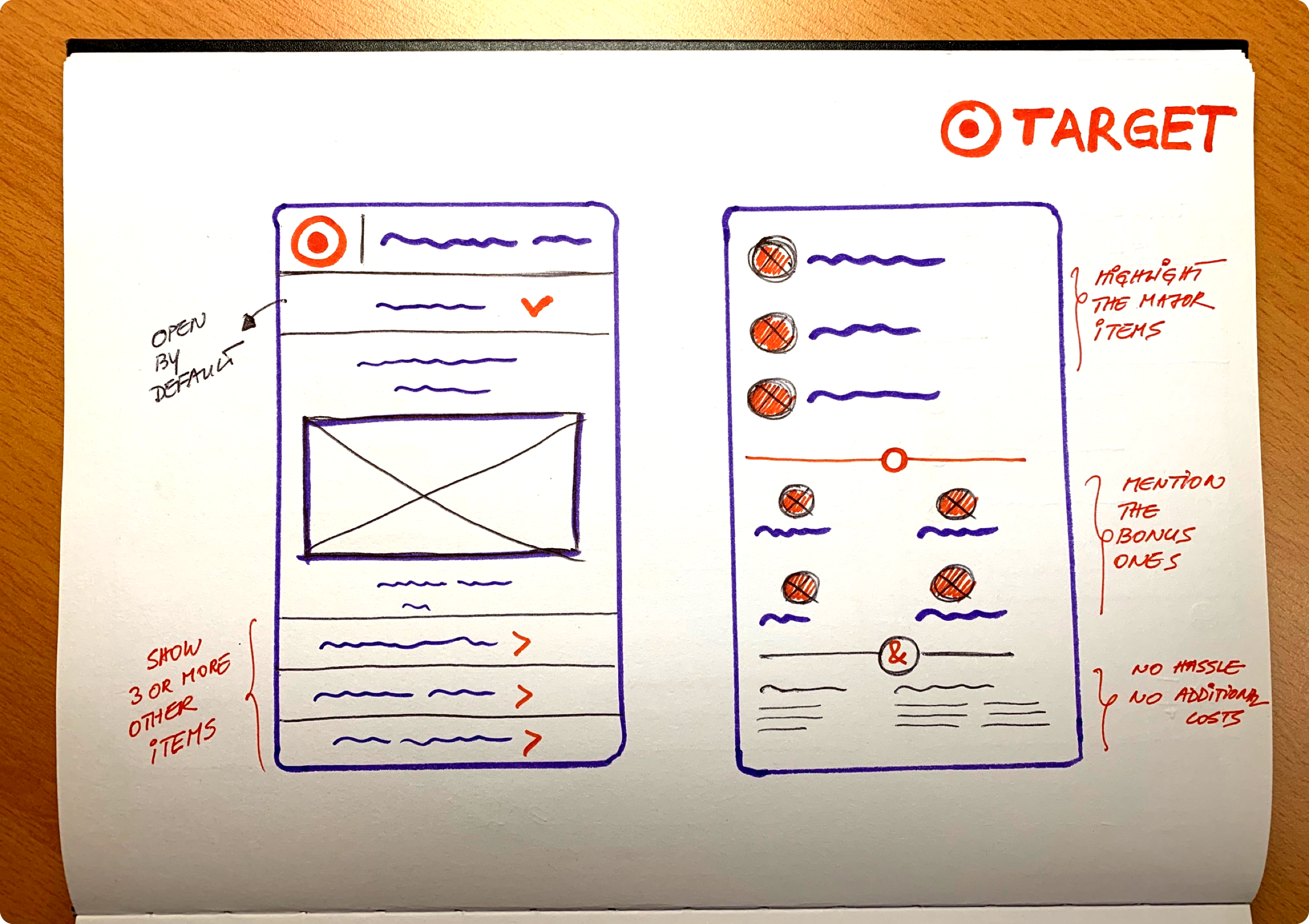 One of the initial steps in the process was to sketch a few key ideas on paper and share them with our team and the stakeholders. Introducing the main sections as clickable tabs, rather than having them all on one long page, was one of the proposals. These sections were highlighting the fact that Target's Care Plan offers real protection (or reimbursement, if not possible to replace or repair), showing what a typical manufacturer's warranty covers versus the comprehensible plan offered by TARGET.