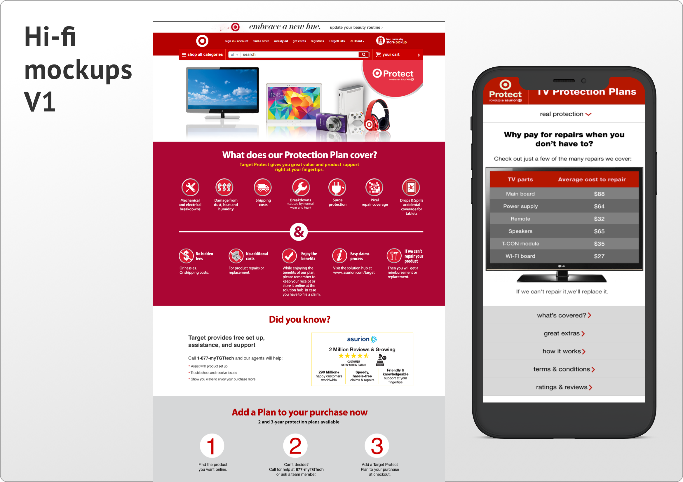 Design a mobile + desktop experience that would seamlessly incorporate into the existing Target website (and potentially within their mobile app), which informed and enabled the user to purchase additional warranty, without interfering with the item purchasing process.