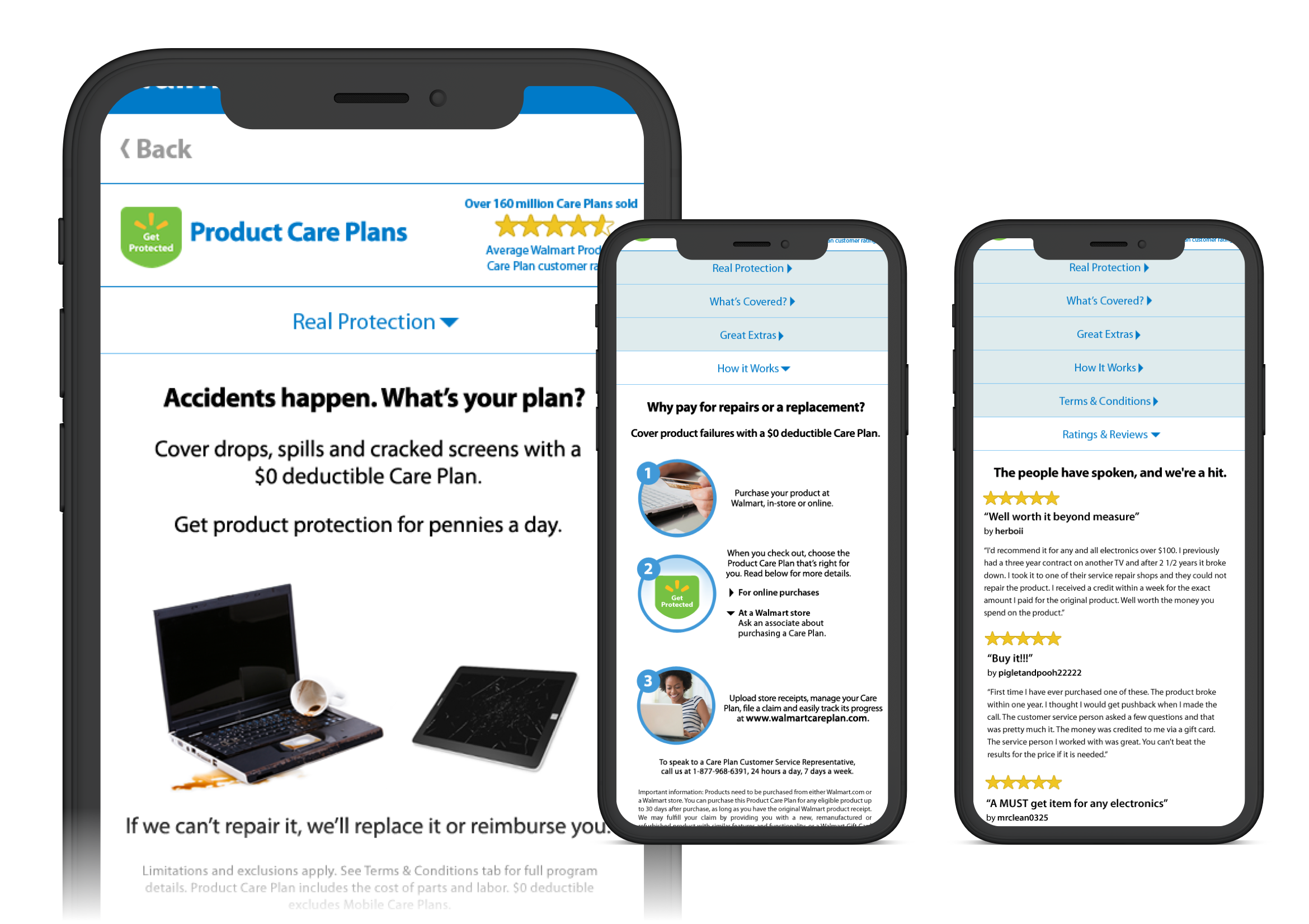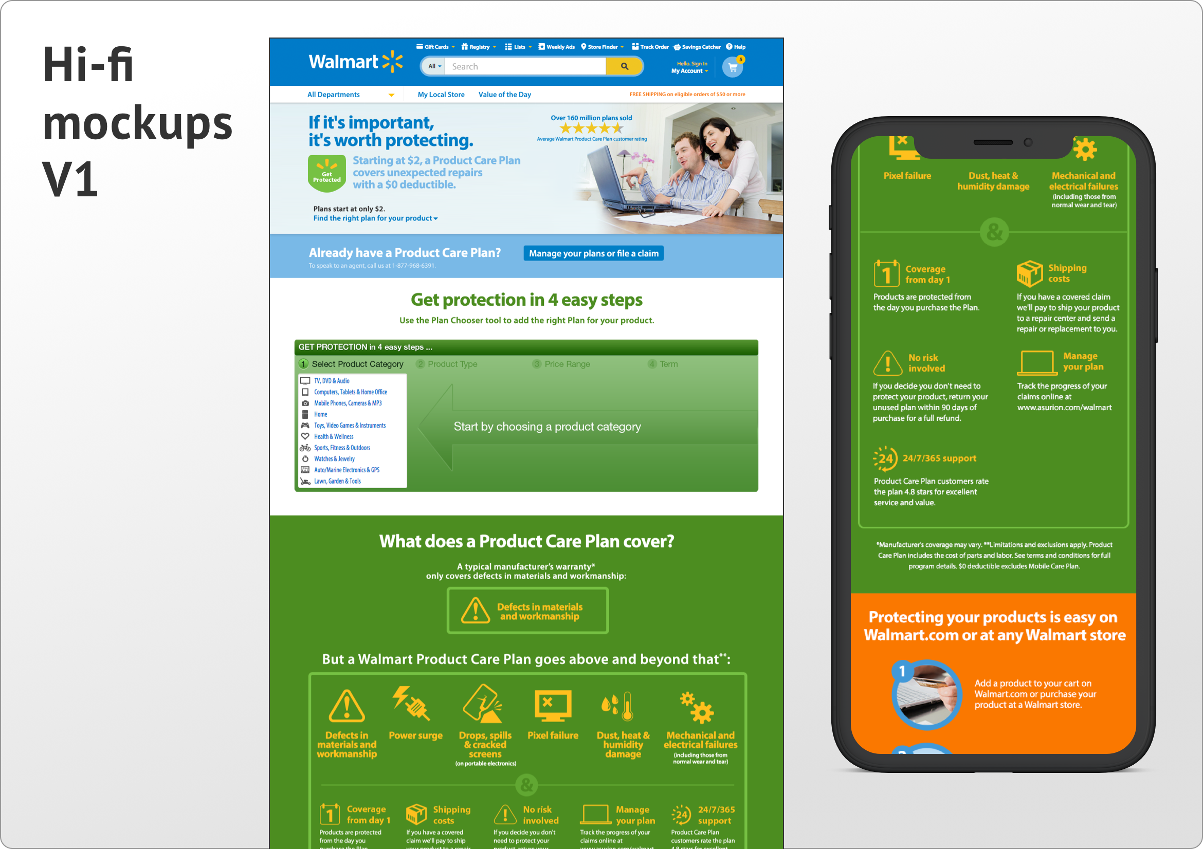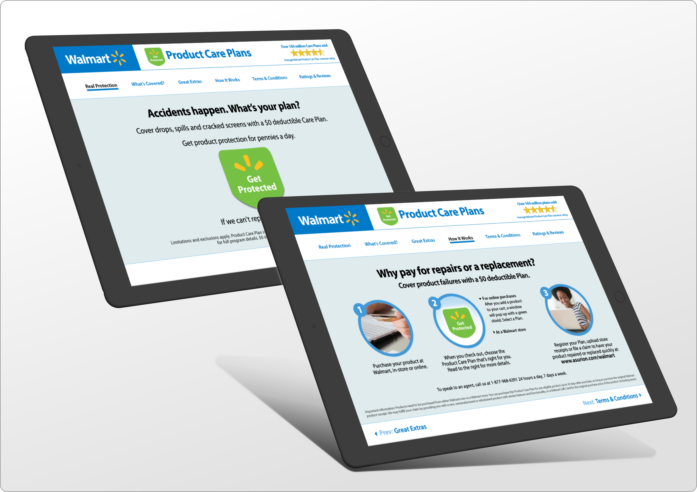 Walmart's extended warranty program is advertised under the "Get Protected" branding, and it's administered by Asurion. It is this section of Walmart's mobile and desktop experience that my team worked on.