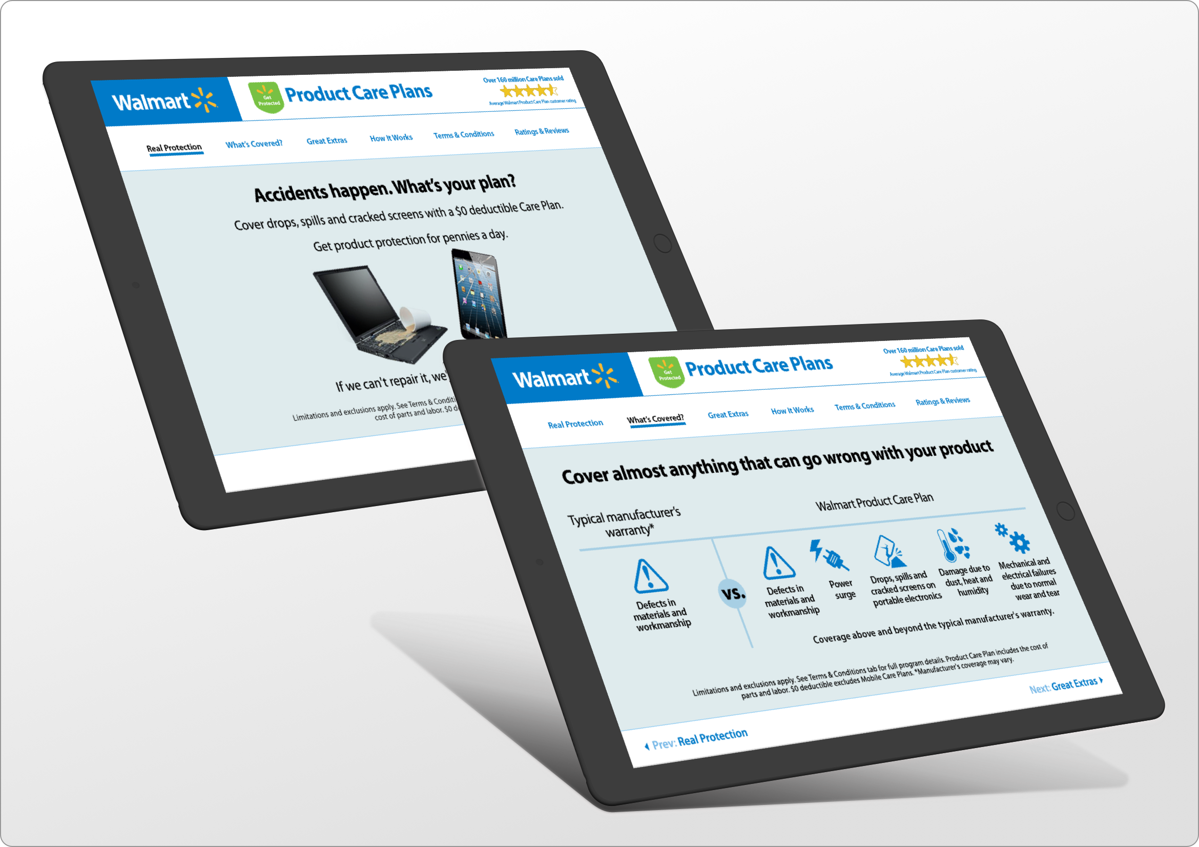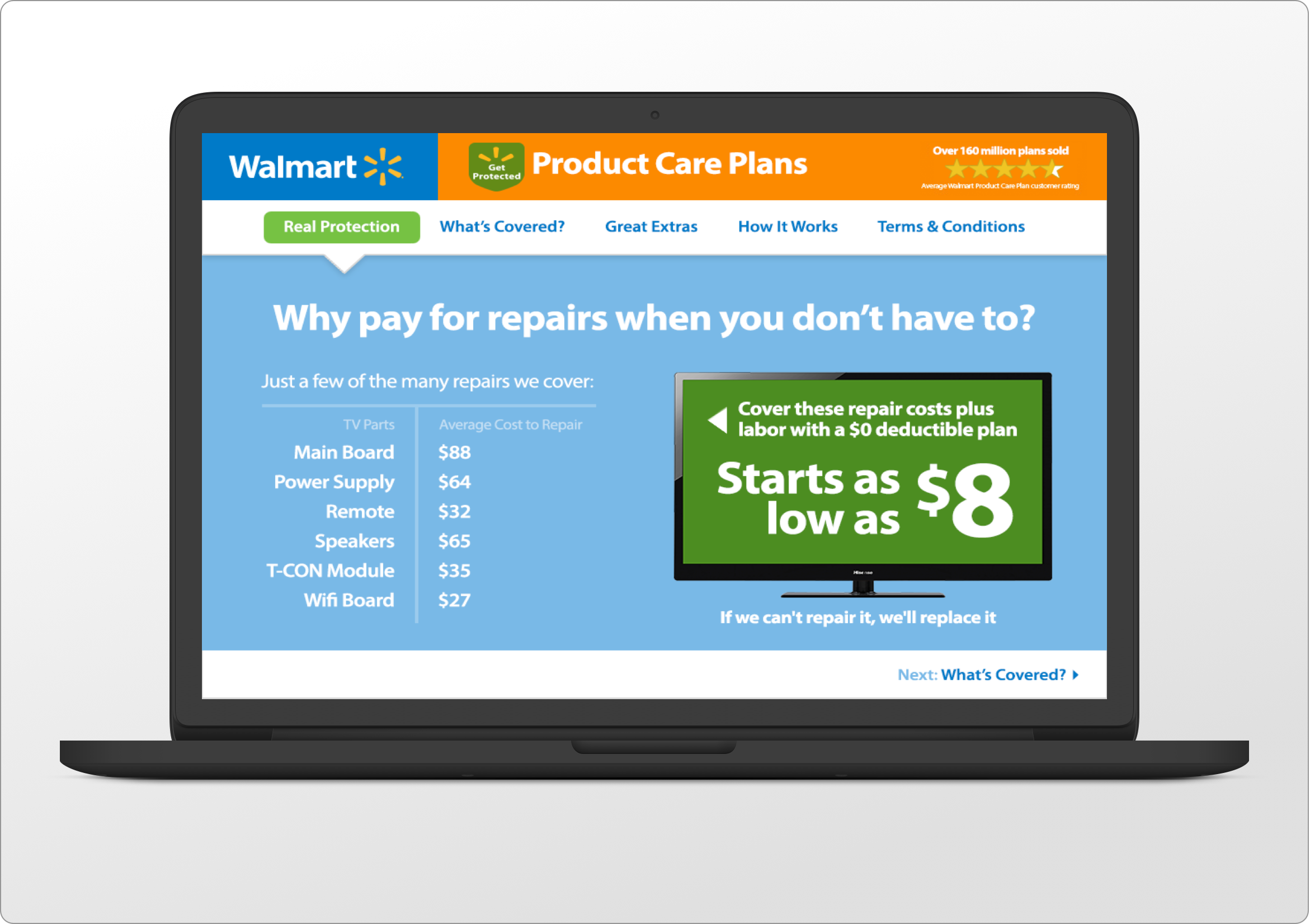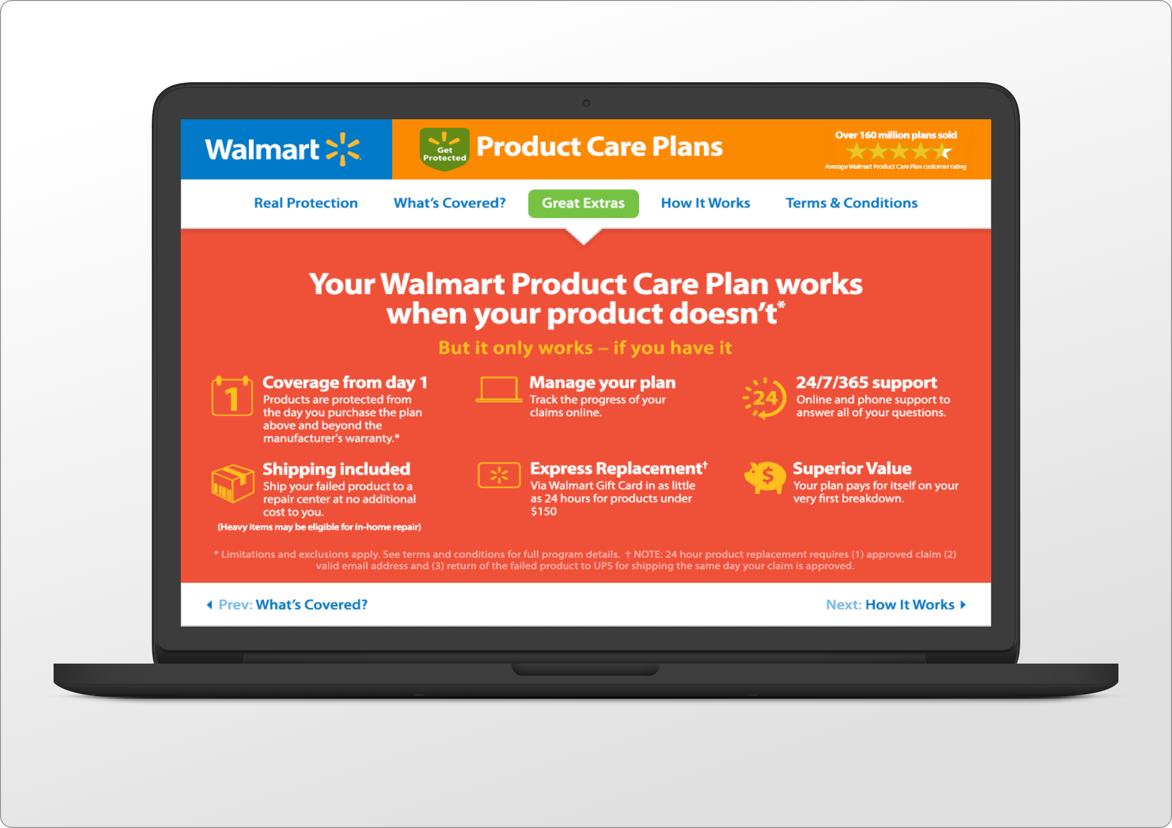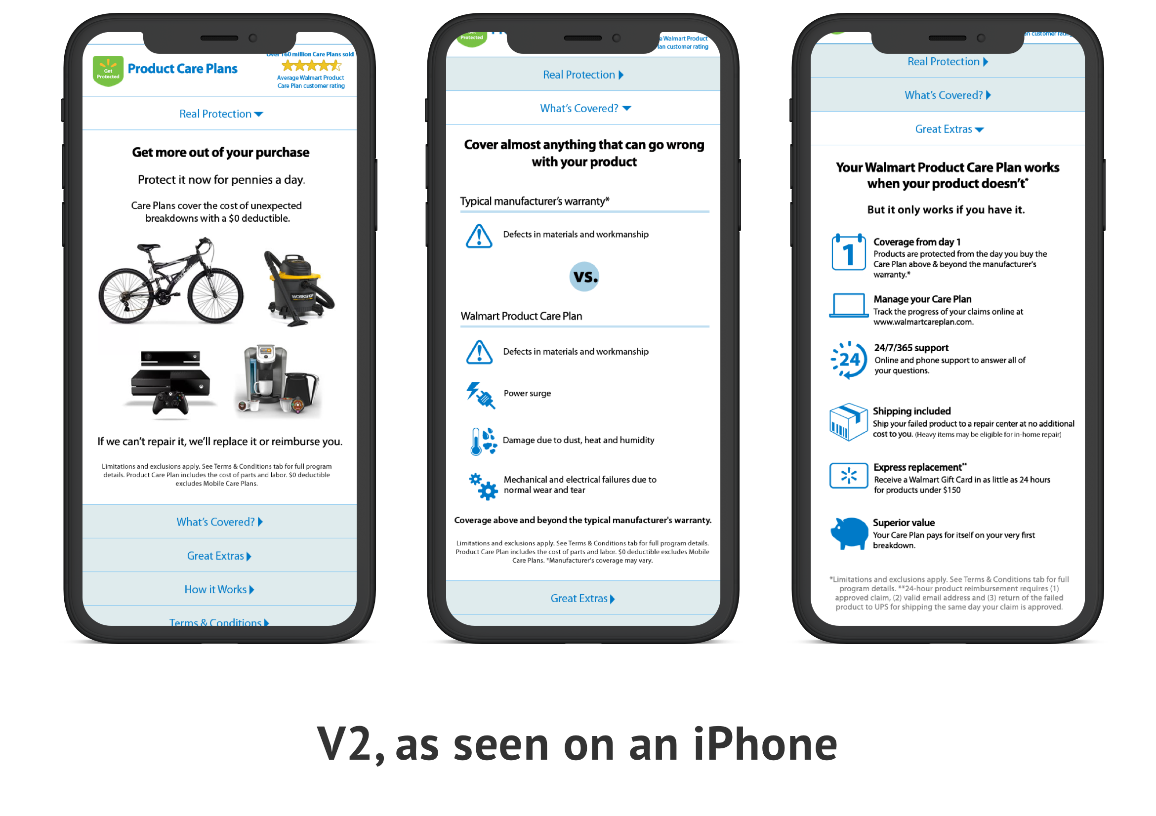 Walmart's extended warranty program is advertised under the "Get Protected" branding, and it's administered by Asurion. It is this section of Walmart's mobile and desktop experience that my team worked on.