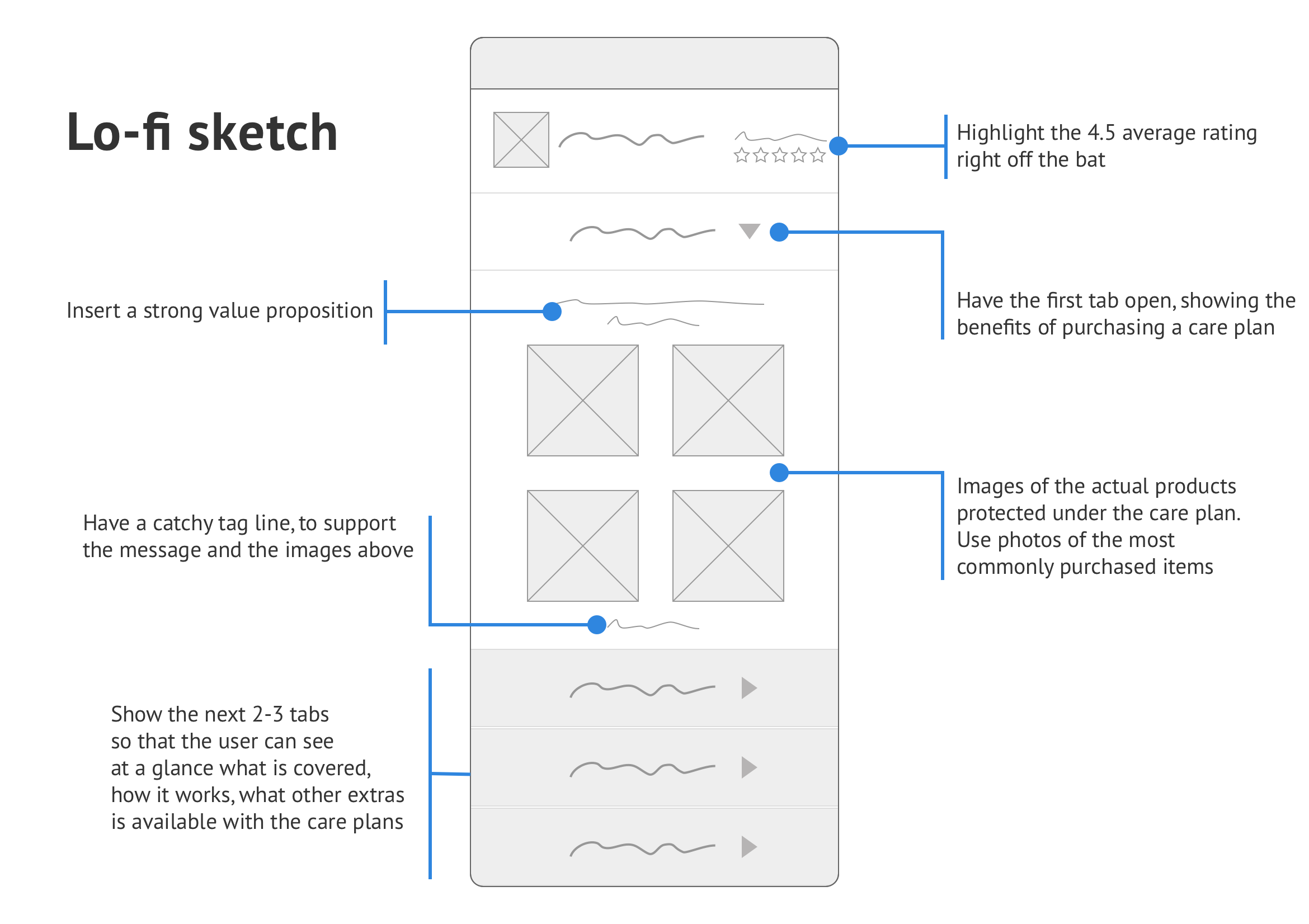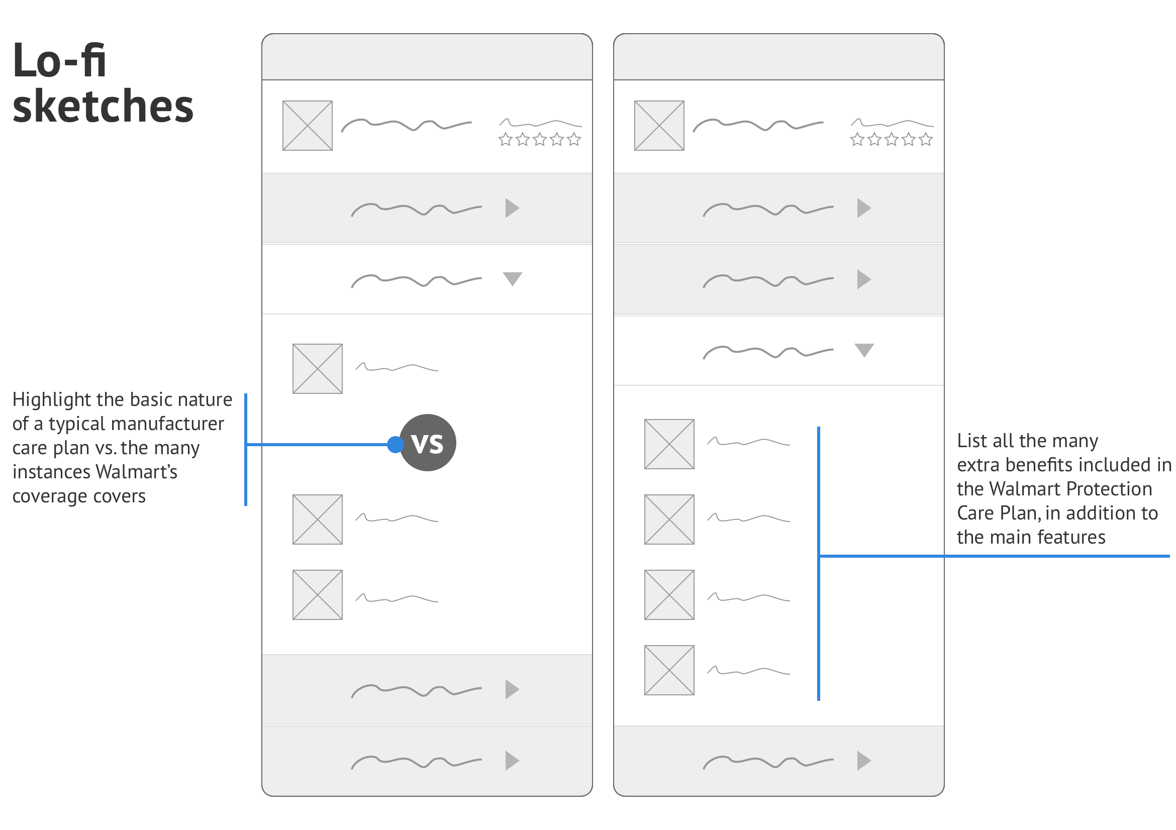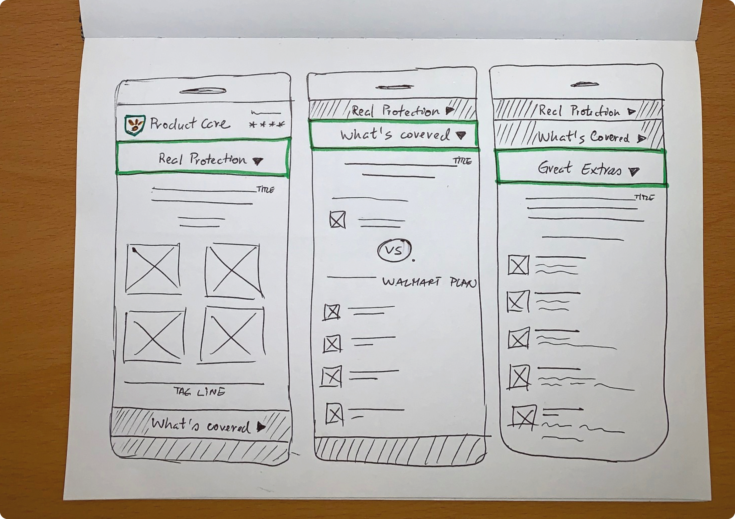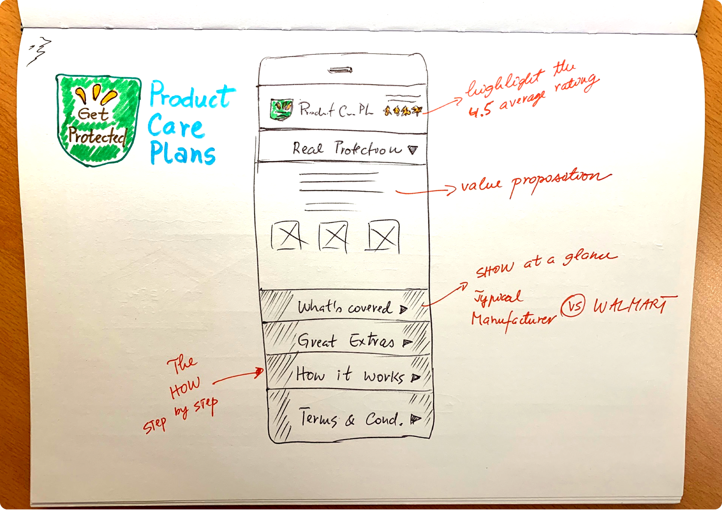 One of the initial steps in the process was to sketch a few key ideas on paper and share them with our team and the stakeholders. Introducing the main sections as clickable tabs, rather than having them all on one long page, was one of the proposals. These sections were highlighting the fact that Walmart's Care Plan offers real protection (or reimbursement, if not possible to replace or repair), showing what a typical manufacturer's warranty covers versus the comprehensible plan offered by Walmart.
